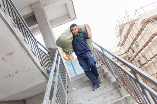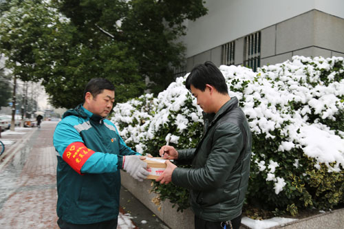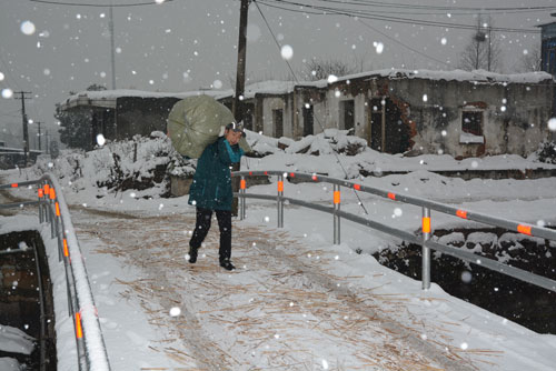 大雪阻碍了揽收邮,徒步揽收邮件,扛着邮包步行。