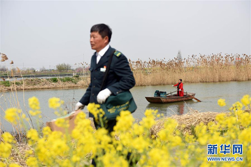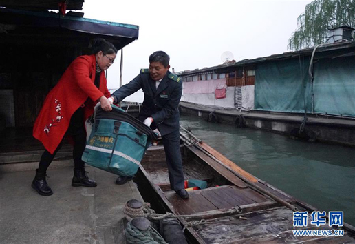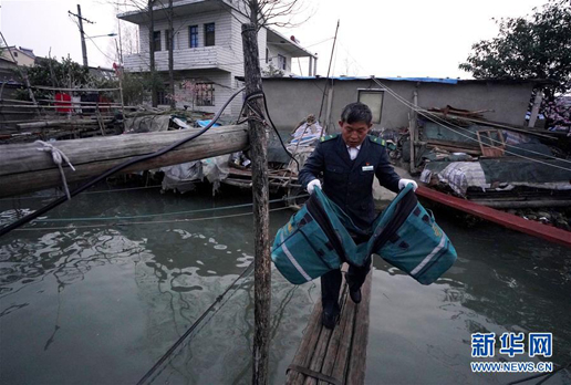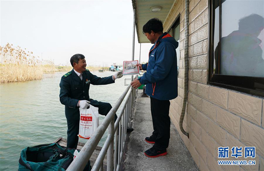 3月30日,唐真亚带着邮包来到码头,准备出发送邮件。 新华社记者 季春鹏 摄