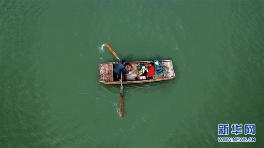3月30日,唐真亚划着小船和妻子闫玲前往新滩村送邮件(无人机拍摄)。新华社记者 季春鹏 摄
