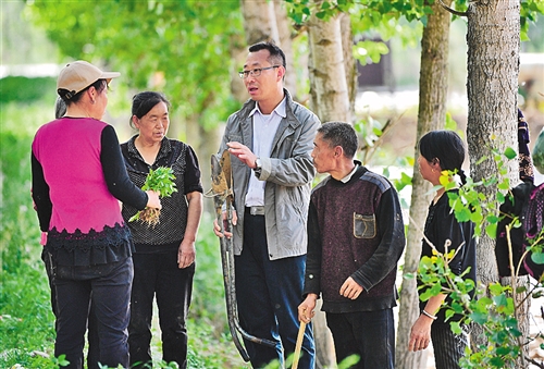 郝军在田间地头向种植辣椒的贫困户教授辣椒种植器使用方法。对这块试验田,他们3人有个约定,最终利润要向贫困户分红。