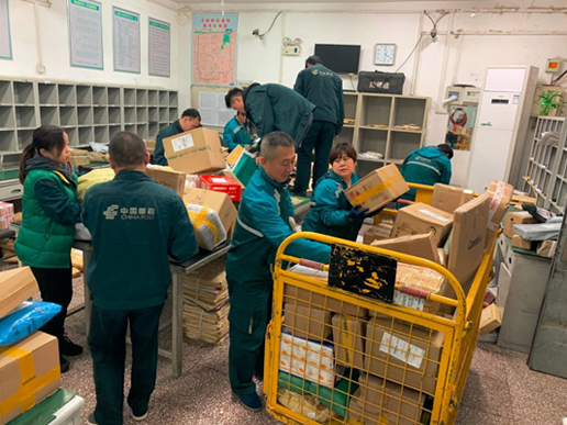 东四邮局北新桥投递部的邮递员们开始分拣新到的包裹(央广记者 冯会玲摄)