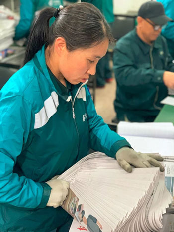 东四邮局投递部的早晨是从7点开始的。砸邮戳、数报纸、分信件,忙而不乱。几十斤重的一厚摞报纸砸到桌子上,只见他们右手一翻变成漂亮的扇面,左手拇指和食指一抬一压快速掠过,转瞬间每个人就数出了自己要送的报纸数量。