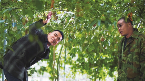 科技特派员与星溪乡地平村村民(邮储银行客户)研究百香果挂果问题。
