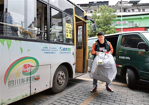 下午3点,淮口镇邮政支局揽投员叶先科将两袋装满100多件邮件的包裹带到淮口镇公交车站,公交车司机贺学接过包裹放到了公交车上,通过公交班车运输到五凤镇客运站,五凤镇邮政支局投递员在接收包裹后开展投递。