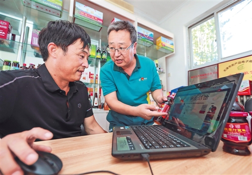 每到一个农家院,刘大方都积极推荐邮乐网主推的农特产品。□沈岳 摄