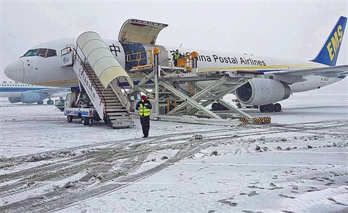 11月12日,子夜的长春龙嘉国际机场迎来今年入冬以来首次强降雪,邮航驻龙嘉机场机务人员立即启动冰雪保障模式,做好航班抵达后的接机准备工作。与此同时,邮航长春办事处人员提前到达停机位清理积雪,并开展地面保障作业。上午8点半,“双11”加班专机cf9060航班抵达后,卸机升降平台车在第一时间停靠指定位置,在规定时限内完成邮件卸交。