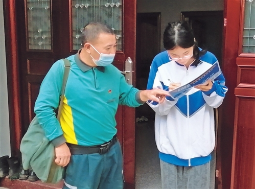 刘彩陆在投递高考录取通知书邮件时,不忘叮嘱考生认真核对签收。