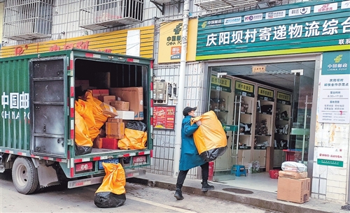 邮政揽投员将快递包裹交付至庆阳坝村寄递物流综合便民服务站。□杨振伟 摄