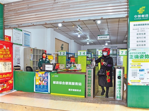 1月12日9点,冬日的阳光暖暖地洒在黄许镇邮政综合便民服务站的门前。此时,客户越来越多,寄年货的、取邮件的……年味越来越浓。