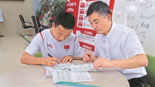 在杭州亚运会龙舟项目中夺冠的湖北省襄阳市老河口籍选手孙嘉豪(左),来到孟楼镇邮政网点,体验邮政服务,共贺世界邮政日。