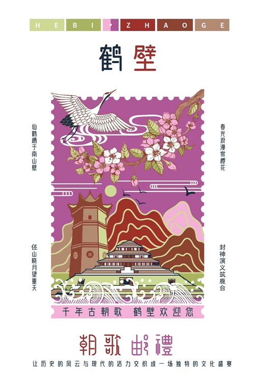 鹤壁历史悠久,文化底蕴深厚,穿城而过的淇河古称淇水,是诗歌文化的重要源头,所辖淇县古称朝歌,是殷商文化的发源地之一和《封神演义》神话故事的发生地。今年8月,获知第十届中原文博会将于9月下旬在鹤壁举办的消息后,鹤壁市分公司依托当地丰富的文旅资源,深挖封片卡文化内涵,从封神题材电影等社会热点中寻找灵感,采用当下打卡流行的“套色印章”工艺开发《朝歌邮礼》明信片,作为文博会邮政展位的主打产品。产品研发组倒排工期,筛选了云梦山、古灵山、仙鹤、淇河、樱花节、鹿台阁、太极宫等鹤壁的代表性文化符号,以“千年古朝歌鹤壁欢迎您”为表现主题,选取“仙鹤栖于南山壁”“春光浪漫赏樱花”“伾山晓月望重天”“封神演义筑鹿台”为创作题材,加班加点设计出了七色印章。在河南省邮政分公司的大力支持下第一时间完成了明信片报批,及时下厂印制,确保按时到货。