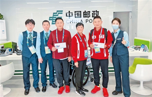 10月22日晚,杭州第4届亚残运会在杭州奥体中心体育场隆重开幕。中国集邮有限公司特别发行《杭州第4届亚残运会开幕》纪念封一套1枚。该纪念封贴有《体育》主图个性化邮票,附图表现本届亚残运会会徽“向前”,生动形象地诠释了奥林匹克精神,也承载着残疾人战胜困难、完善自我、创造幸福的期盼。图为中国代表团射击运动员杨超(左三)、黄兴(左五)来到亚残运村临时邮局购买纪念封。