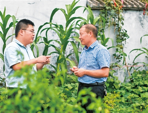 李璟(左)与村支委商讨如何提高“公共菜园”利用率。