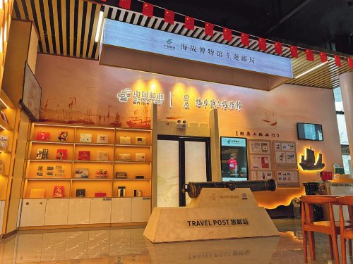 走进东莞邮政海战博物馆“旅邮站”,一个充满历史气息的“旅邮”空间便展现在眼前。该“旅邮站”位于东莞市鸦片战争博物馆游客服务中心内,整体布局庄严大气。一进门就可以看到的炮台模型很容易让人联想起鸦片战争那段历史。“旅邮站”内设邮政文创展示区,配套纪念邮折、明信片、文创产品等虎门文化主题邮资票品,供游客选择。最有特色的当属那款以海战博物馆为主题设计的套色印章,包含炮台、林则徐、鸦片战争中虎门人民抗英纪念像等内容,可以让游客在体验集邮盖章乐趣的同时,加深对那段历史的了解。