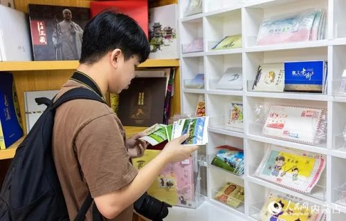 6月18日,来自福建的游客在呼和浩特市玉泉区塞上老街旅游休闲街区“塞上主题邮局”内参观、选购。