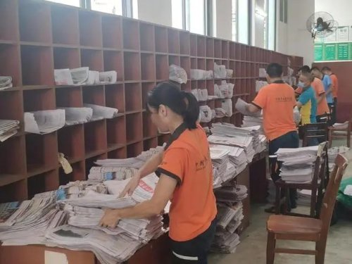 在澄迈县邮政分公司邮件处理中心,分拣和投递人员加班加点,集体投入台风期间停运的报纸分发和投递工作中,确保第一时间将报纸投递上门,展现邮政速度。