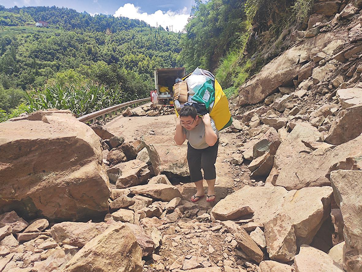 因山体滑坡、道路塌方造成邮路中断,邮政员工接力背运传递邮件。□肖婉君 摄