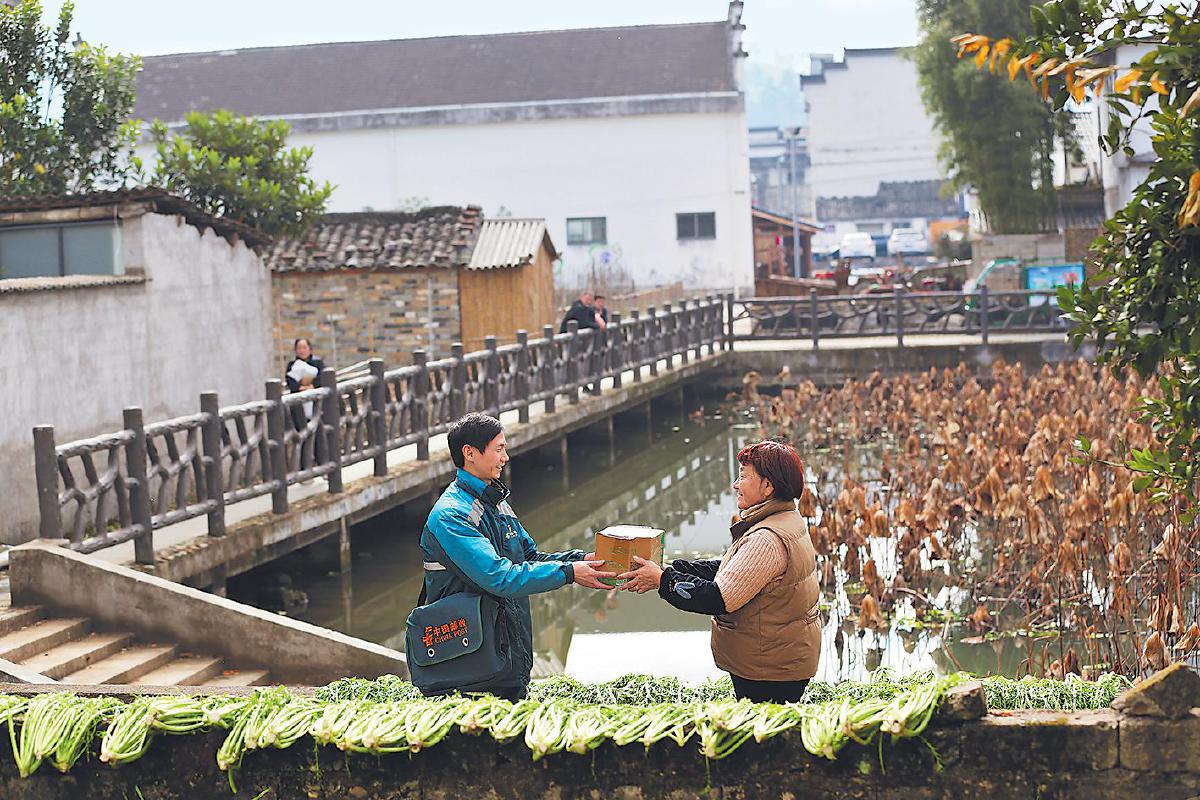 邮政送快递邮件进村,打通村民网购“最后一公里”。 □陈师 摄