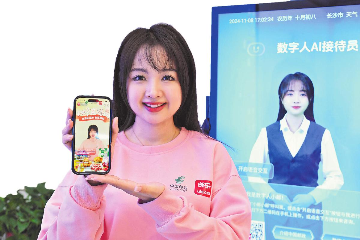 11月7日,在湖南长沙的邮乐直播产业基地一层展示大厅,面对本报采访组的提问,接待大屏里的数字人“小邮”应答自如。墙上的广告屏里,播放着“小邮”进行特色农产品直播的画面。一旁,这个“小邮”的原型——基地金牌主播刘思颖正一脸微笑地看着我们。