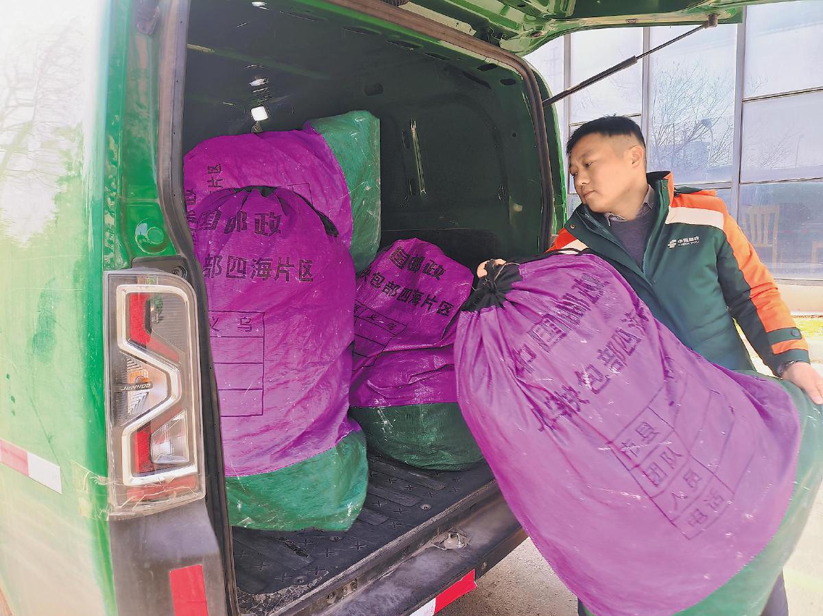 陈地久揽收邮件后装车。 □厉楠 摄