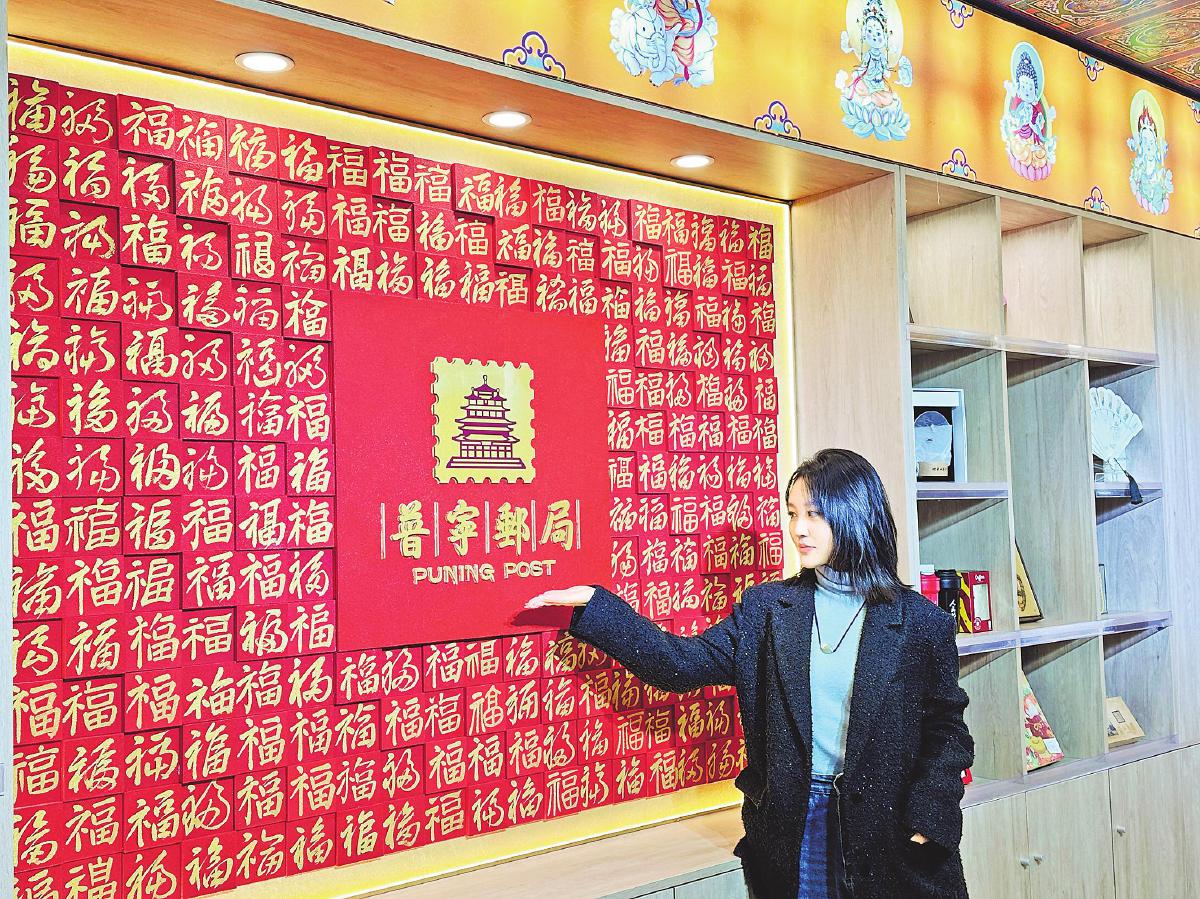 福,是中国人最美好的祝愿。祈福邮局内,字体各异的百福字格外醒目,在百福字前拍照留念,期待福气如影随形。在文创商品区,祈福文化被创意开发成种类繁多、风格各异的明信片、邮折和纪念封等产品。400多款邮政文创产品摆放整齐,“蛇玩偶 明信片”的蛇年福袋袋袋不同,买一款抽出一年的好运气;十二生肖系列与守护佛纸徽章套盒,鲜艳的配色和祈福守护的寓意,是年轻游客装扮自己背包、服饰的首选产品;平安喜乐流沙系列冰箱贴、山海祥瑞系列冰箱贴和钥匙扣、地藏系列文创符和冰箱贴等都是普宁祈福邮局的热销产品。特别定制的“福禄寿喜”纪念封和透卡,寓意着福气到来、官禄亨通、人寿年丰、喜事降临。