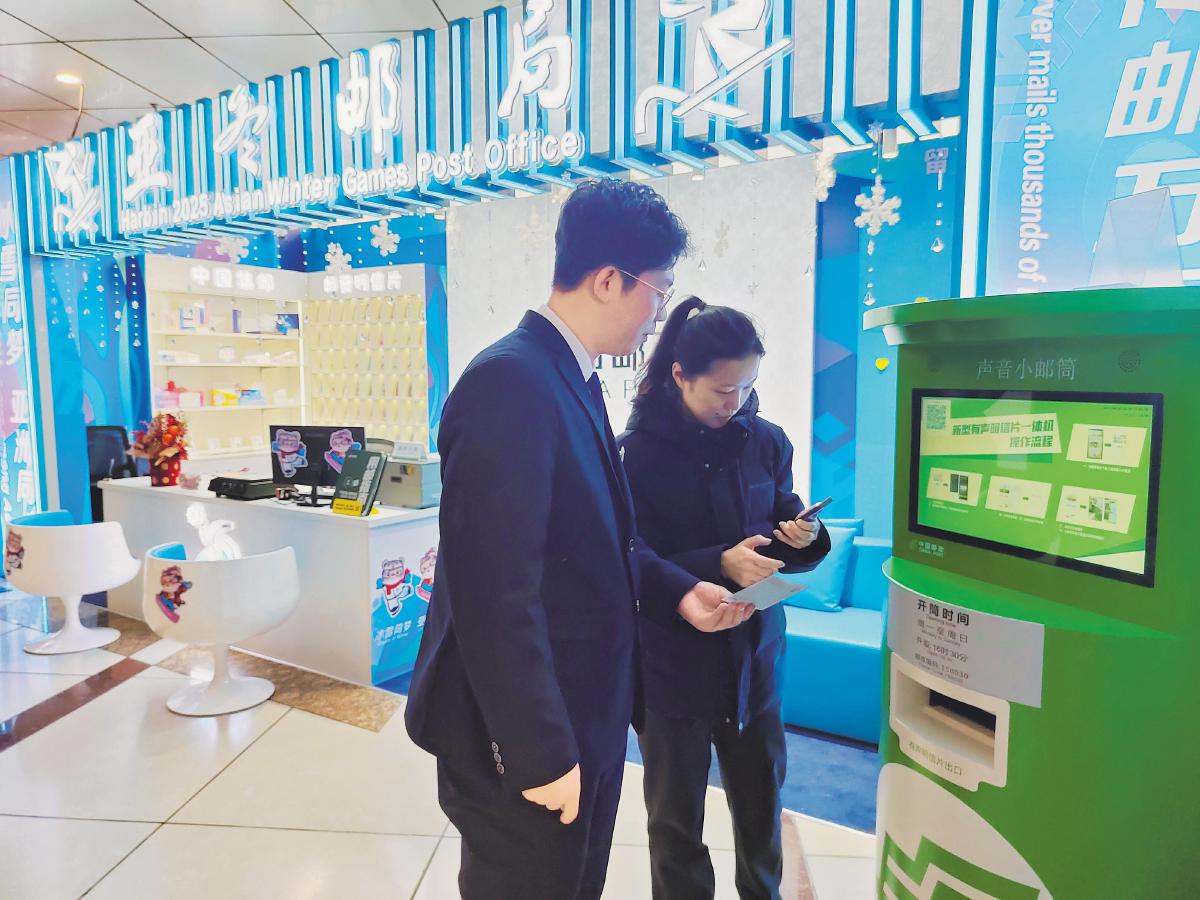 亚冬会志愿者在北大荒运动员村主题邮局打卡留念。□吴晓天 摄