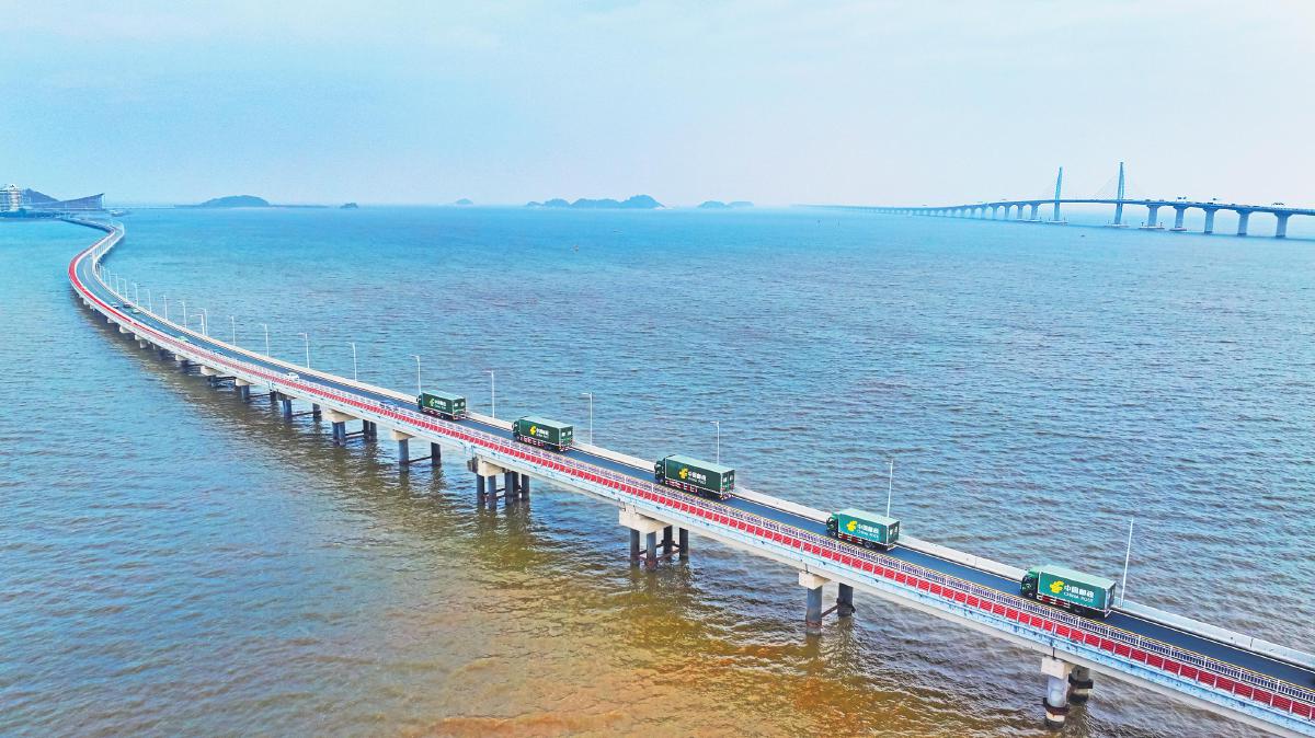 邮政车队在港珠澳大桥的引桥上有序前行,宛如一条绿色的丝带连接着粤港澳大湾区。邮政服务为区域内的物流运输和经济交流提供了有力支持,促进了大湾区物流一体化进程,助力区域经济的繁荣和发展。 □陈师 摄