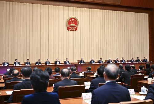 3月4日上午,十四届全国人大三次会议主席团在北京人民大会堂举行第一次会议。全国人大常委会委员长赵乐际主持会议。 新华社记者 燕雁 摄