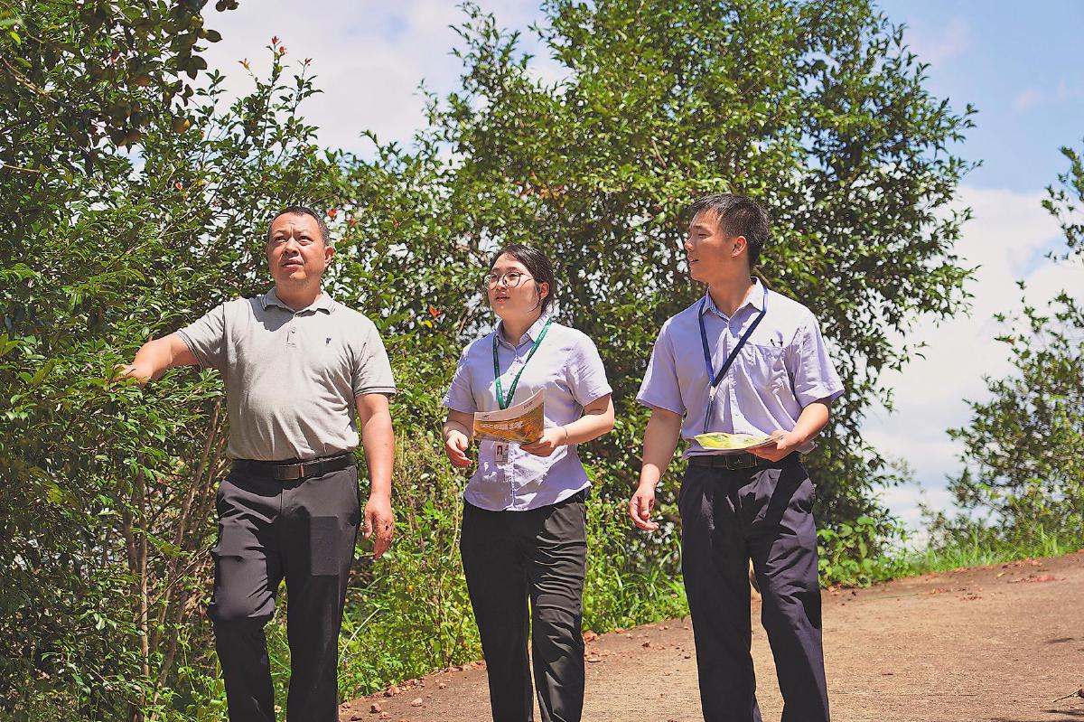 梅州市分行信贷员跟随客户查看农作物生长情况。