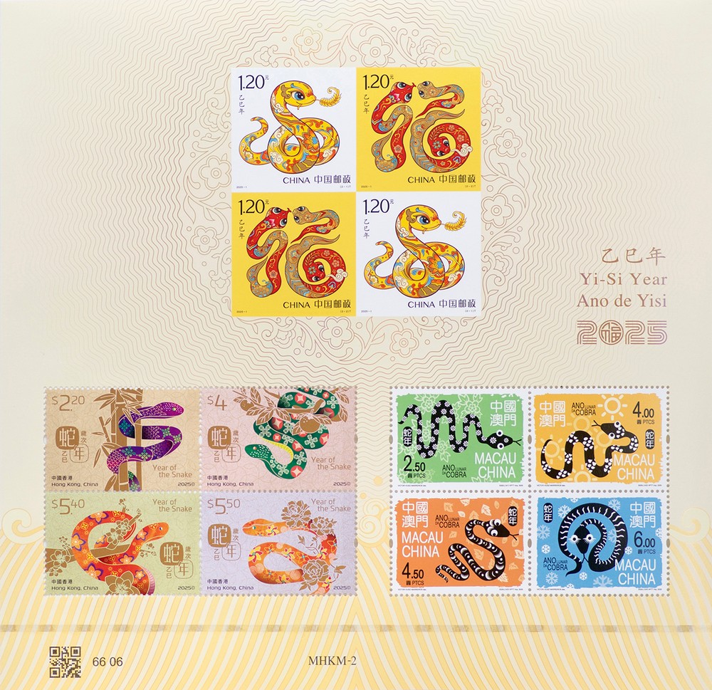 另与香港邮政、澳门邮电共同印制同题材三地小全张1枚,内含中国邮政邮票4枚(2套,无齿孔),香港邮政、澳门邮电邮票各4枚。小全张编号:mhkm-2。成品规格:206×200毫米。版别:胶雕套印。印制厂:河南省邮电科技有限公司。邮折售价:人民币52元。计划发行数量:40.5万枚(不含港澳地区)。
