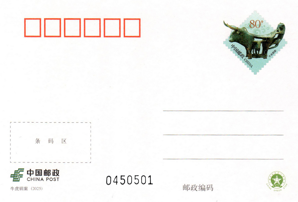 中国邮政定于2025年2月12日发行《牛虎铜案》普通邮资明信片1套1枚。详情如下:
