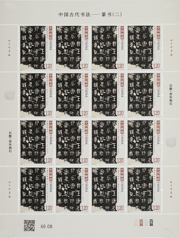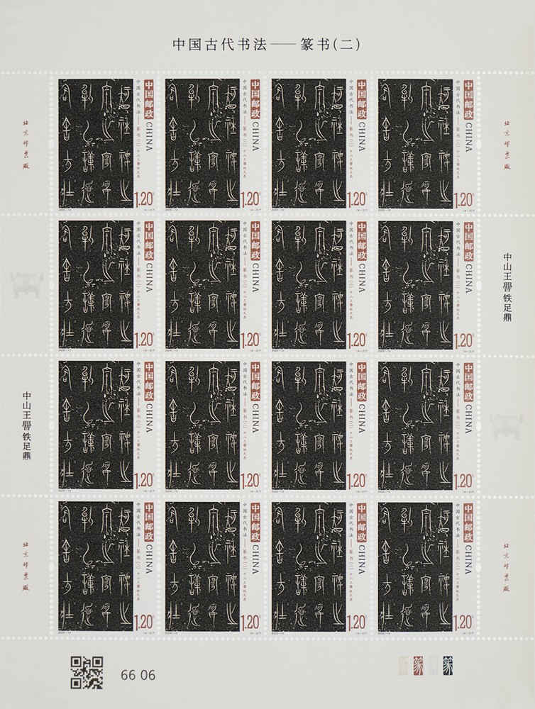 铁足鼎的外壁刻满了77行铭文,共计469个字,是目前发现的铭文最长的战国青铜器,铭文展现绮丽飘逸的装饰趣味,是先秦古文字精品奇珍;石鼓是形似圆鼓的一组花岗岩刻石,秦人曾在十面鼓形巨石上刻下十首四言诗,记述君主的游猎盛景,吾车为其中一面,石鼓文作为石刻之祖,记录了大篆向小篆过渡的笔意;琅琊刻石则留存李斯小篆的典范,是中国最早的刻石之一,是秦朝统一全国文字的典范之作,虽仅存秦二世诏书部分,仍可窥见“书同文”的历史印记。小型张选用西周何尊,其“宅兹中国”铭文不仅是“中国”一词最早实物与文献见证,也成为中国邮政标志的设计灵感来源。