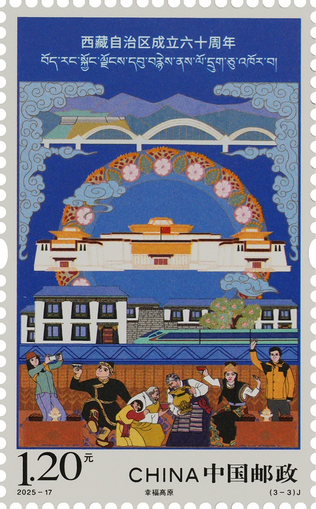 中国邮政定于2025年8月15日发行《西藏自治区成立六十周年》纪念邮票1套3枚。详情如下: