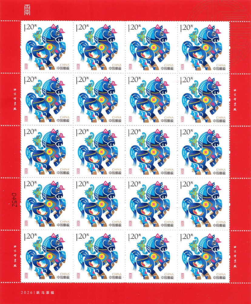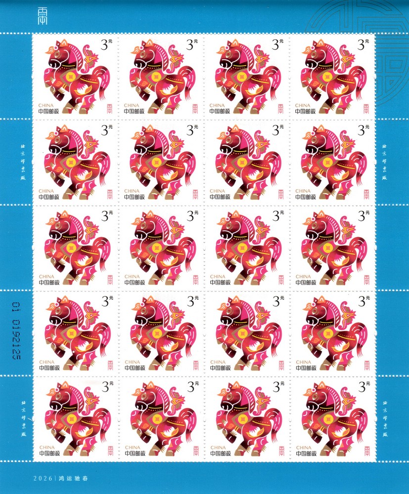 注:采用“跃马添福”和“鸿运驰春”邮票印制小全张1枚,规格为120×190毫米。小全张专用于2026年中国邮政贺年有奖产品(祝福卡型15元)。